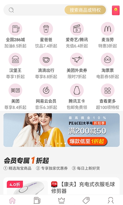 4.会员充值特惠:尊享爱奇艺、腾讯视频、芒果TV等各大会员充值特惠,天卡3元起,周卡6折起。