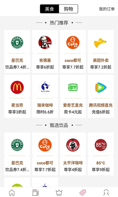 2.美食特惠:星巴克、麦当劳、肯德基等大牌连锁美食,线上购券6折起;