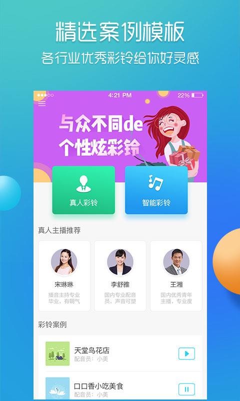 彩铃易app是一款专为手机用户打造的手机铃声应用,彩铃易app涵盖了海量的高品质铃声,并且还有最新,最火爆铃声,彩铃易app让用户可以每天根据不同心情换不同的铃声。还能让自身的企业信息能够获得更好的宣传策划,是很多企业制作手机彩铃的优选服务平台;APP联合了中国移动通信、中国电信网、联通公司三大运营商,考虑了很多企业在线生成手机彩铃的要求,即时获得需要的企业彩铃;提供了很多企业彩铃的模板,您能够线上开展试听,制作与公司信息相符的手机彩铃。