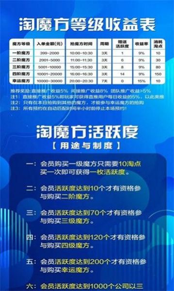 淘魔方app是大家线上关注下载的一个好玩在线接单赚钱的平台。一款收益等级非常分明的手机推广赚钱的平台。淘魔方app虽然加入了区块链的元素,但是淘魔方app还是主要是靠推广来赚钱,也就是说邀请的好友越多给你带来的报酬也越多!全新的推广挖矿平台,淘魔方app能够给用户们带来更加丰厚的收益,在这里进行各种推广,还非常的轻松,每天只需要一点时间,就能获得丰厚收入,里面将融入了非常多的玩法形式,有全球抢物,交易所,c2c交易平台,在线进行挖去虚拟资产,让你轻松的进行赚钱。