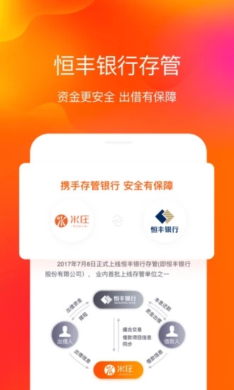 米庄app是一款可靠的网络借贷信息中介平台,为借贷双方提供优质便捷的网络借贷信息服务,让出借方出借更安心,让借款方借钱更便捷。平台携手恒丰银行,为您提供线上资金存管服务,让您的资金更安全。