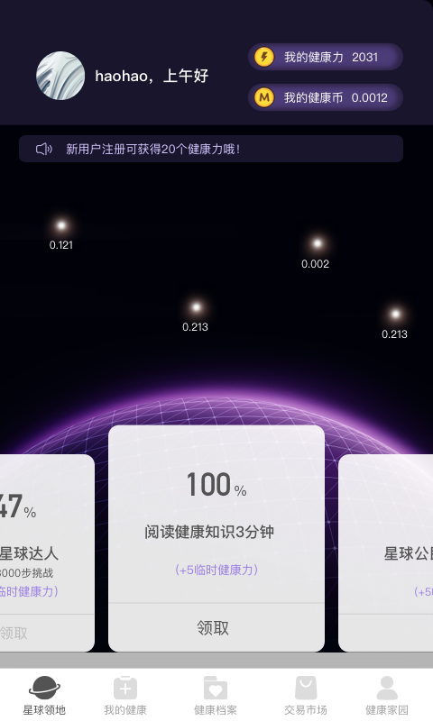 【涨健康力】健康力决定健康币的产出速度,拥有健康力值越高,获得健康力越多,在星球上进行健康评估、健康阅读、步行等活动,可以增加健康力值。