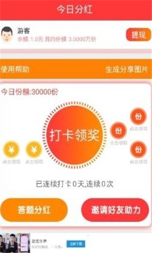 今日分红app是一款最新的很受大家喜欢的一款高质量赚钱分红平台。大家可以很轻松的线上赚钱。大家可以很轻松的找自己喜欢的各种精彩赚钱任务。大家线上还有更多高质量大家很喜欢信赖的一个完成任务赚钱的平台。不管大家是更喜欢什么类型的任务,或者什么时间有空,线上赚钱都是很简单的。在里面主要就是每天签到分红赚收益,赚零花钱很快速也很安全,在里面赚收益非常的简单,推广好友一起赚也可以赚到很多的佣金,喜欢网赚的朋友快来下载今日分红app一起赚吧