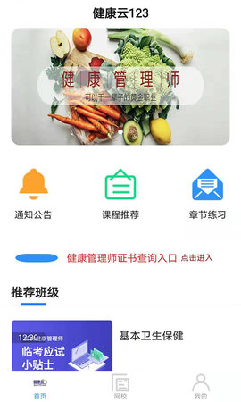 健康云123App是一款健康管理师备考辅助学习软件,能够帮助用户进行分类章节练习,还可以实时接收推荐的课程内容和通知公告,随时随地了解相关健康管理师考证资讯,用户可以加入班级学习也可以自主学习,课程分类详细,让用户学习更轻松,需要的伙伴,在线拥有详细的考试流程等信息,自定义去接收到一些推荐的信息内容,随时都能及时通知到最新的考试消息公告情况。可自行加入到线上班级中,每一个阶段教学计划都是非常详细,让学员们在平台之中能学习更高效。