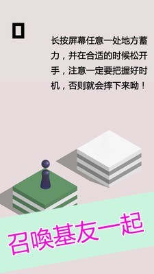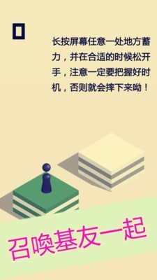 指长按屏幕“i”形小人,不断在各种方形道具上跳跃而获得分数,