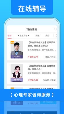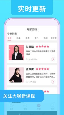 婚姻咨询app是一款全新上线的婚姻爱情方面的软件,十分热门火爆,在这里,它能为你解答很多疑难困惑,为用户出谋划策,非常得实用,平台为我们提供了详细的咨询服务,关于很多方面,比如婚姻挽回,情感婚恋等等方面,帮助情感受害者走出逆境。