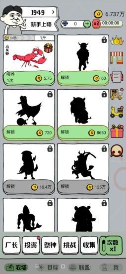 欢乐养殖场赚钱游戏是一款不需要耗费太多精力魔性养殖赚钱的应用,欢乐养殖场手游玩法有趣,玩家需要通过投资农作物升级小龙虾来赚钱,欢乐养殖场角色多趣味十足。欢乐养殖场赚钱游戏是一个养成类小游戏,画面很魔性,玩法也新颖!欢乐养殖场手游玩法不再是以前那种单一的合成,是通过投资各种农作物赚金币来升级小龙虾,欢乐养殖场游戏里有厂长、投资、祭神、挑战、收集、捕捞、联盟,斗虾等等板块,欢乐养殖场休闲养成手游还有十种可爱的农作物陪伴你成长,趣味性相当高!