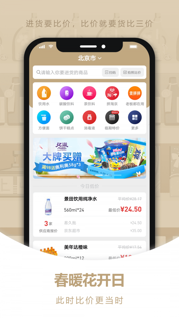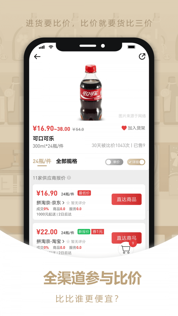 比价要进货,优惠更给力。渠道比价后可以直接提交订单啦,聪明老板聪明进货,货马上送到店喽!