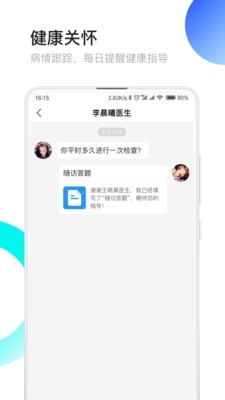 [健康关怀]患者院外可享受VIP级别的病情管理和关怀服务,术后病人和慢病患者的移动端疾病康复管家。