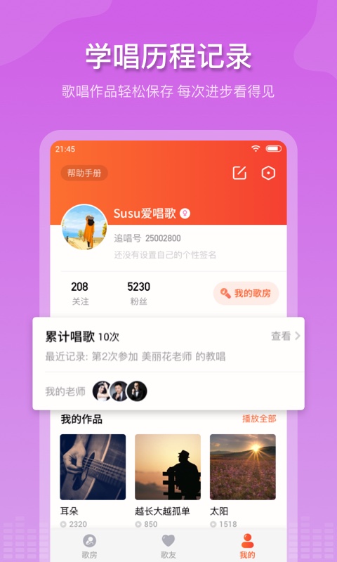 追唱K歌app:这是为喜欢唱歌的用户提供的自由k歌助手,大家可以直接通过手机去学习唱歌,这里有专业的老师教你如何唱歌,不断提高自己的唱歌水平,想要锻炼成歌声,这是一个很好的练习机会,让你更轻松的唱歌!不花钱,明星导师1对1专业教学,轻松唱,同龄歌友在线欢乐开唱,追唱K歌,你的学唱交友专属歌房!让你可以自己在手机上K歌,各种专业的音效加上调声系统,给你带来更好的体验。相信你已经迫不及待了,你还在等什么,赶快来下载体验吧!