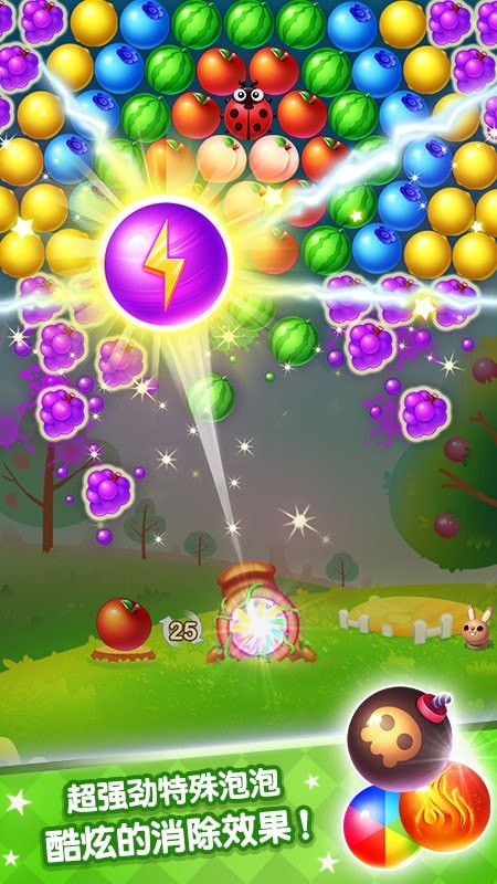 3、成功地消除掉所有的泡泡获取高分,目的是拯救出森林里的小鸟。