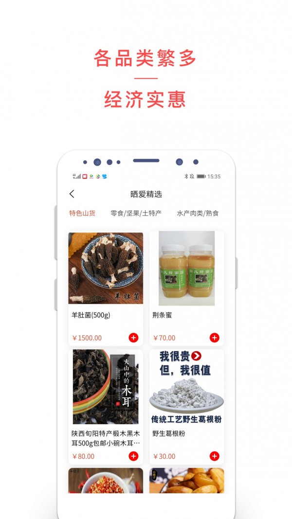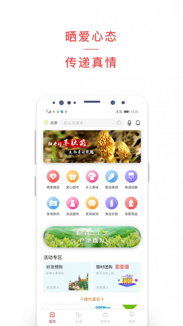晒爱以农副产品、日化品、小家电为主,涵盖了晒爱食品、居家日用、美妆护肤、服装服饰、鞋类箱包、家用电器、电脑办公、运动户外、童装母婴、家居服饰、手机数码、汽车生活等品类。