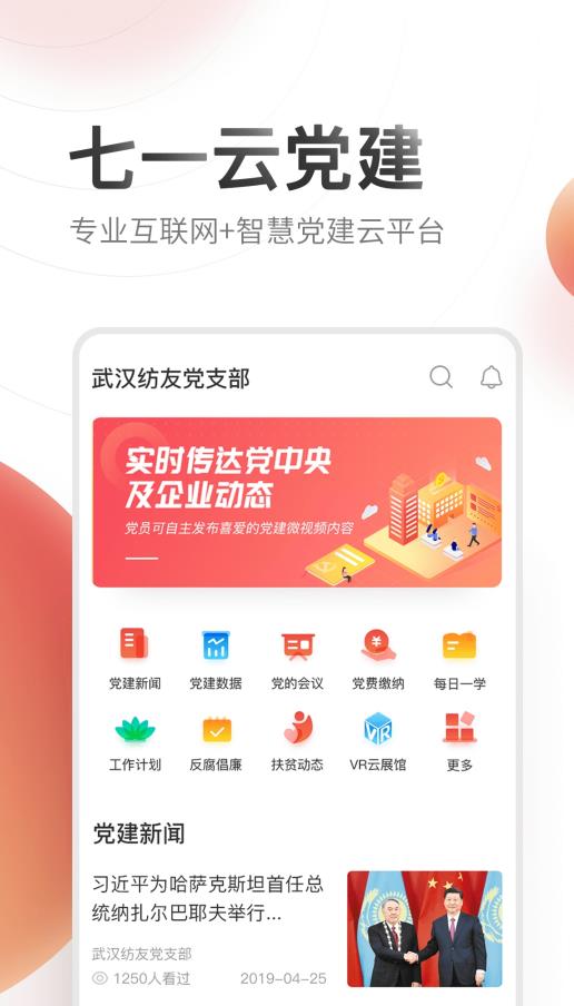 七一云党建官方app手机版是给素有的党员用户们提供各种服务的平台,用户在工作里面的所有会用到的功能,有很多都可以在这个上面找到,让做很多事情的时候就更加的有效率了,这里会在任何时候可以及时的知道全国的党员这方面的资讯信息,能够及时的知道最新的在工作上对用户们的要求,还能在上面去学到特别的多的关于这些的内容,工作上面有要交流的话也可以在上面进行的。