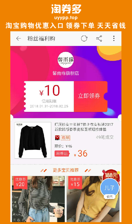3、通过淘宝内部优惠券购买淘宝,天猫的商品,可以找到你找不到的优惠券;让你购物省50%以上;淘宝限量领券,淘宝大额优惠券,天天更新;超值低价,天猫品牌优惠券,亏本冲量;无忧购物,包邮,送运费险,7天无理由退货。