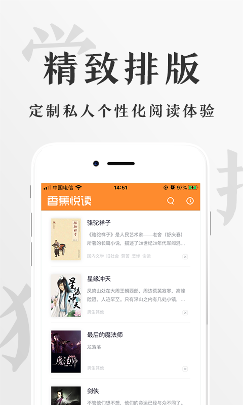 香蕉悦读APP,一款为喜爱阅读的小伙伴所量身定制的手机阅读神器,香蕉悦读APP为广大读者打造良好的阅读体验,支持夜间模式阅读、可随心设置字体大小、亮度、间距、护眼背景色和翻页模式,还支持添加书签。您还在为书荒发愁?您还在为书本携带不便烦恼?在这里,你可以畅读海量精品小说,涵盖男生女生喜爱的全部类型。现代都市、玄幻奇幻、武侠仙侠、悬疑侦探、经典图书等各类书籍应有尽有。