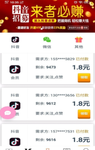 2、注册之后首页有大量的抖音快手等点赞任务,0.6到6元不等。