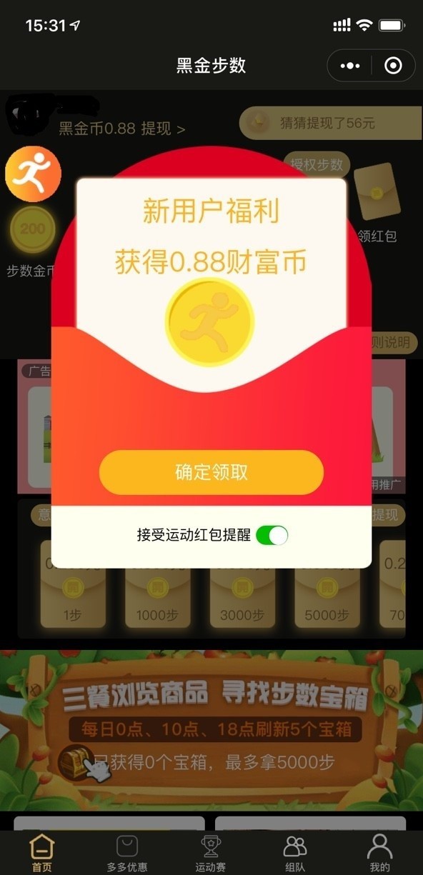 每天步行3000步,即可在黑金步数app上获得奖励,实现零投资,进行步数分享推广也可以获得奖励。