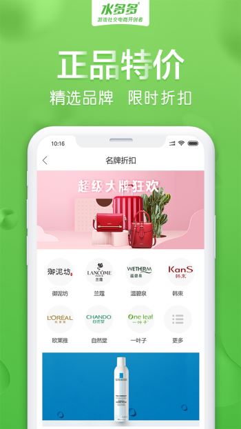 水多多APP是一款专为女性设计的购物平台,主要提供各种美妆美容产品,其次才是其他类型商品,由河南神游网络科技有限责任公司打造;平台提供美妆、母婴、食品、服饰、洗护等各种商品资源,无论是何种年龄阶段以及何种喜好取向的用户都能买到自己满意的商品,让用户可以买的尽兴用的高兴;平台定期更新各种优惠活动,用户参与就能享受到折扣福利,还有包邮、特价等福利等你来拿,购物还能省钱,实在的不行;平台汇聚全球潮流产品,与众多大型品牌达成合作,产品价格和款式、质量与国外一致,保证用户购买到的一定是正版产品。