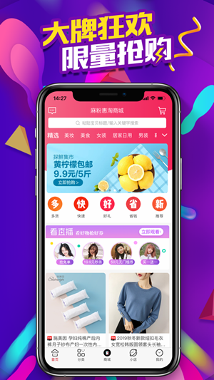 麻粉惠淘APP是一款购物省钱的APP,平台里有超多的大牌任你选购,并且都是限量秒杀,绝对全网最低价,能够抢到就是赚到,平台有不同的购物福利活动,都能够在这里快速的购买,并且还有海量的分类都能够实时的买到自己最想要的商品,专为喜欢购物的人群打造。这款软件当中有着海量的优质商品,超多的商品种类,用户的日常购物需求都可以通过软件满足,并且这款软件每天都会为用户更新大量的购物优惠券,用户可以线上一键领取,先领劵再购物,可以为用户省下不少的购物开销,还常常有优惠活动,有需要的朋友可以来下载使用。