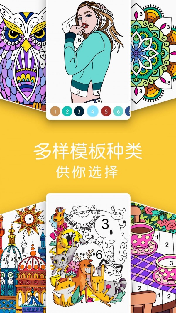 1.每张图片都用数字标记,选择你喜欢的画作,按照数字顺序点击涂色完成创作,