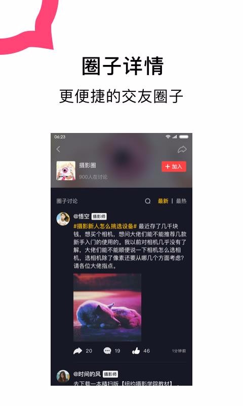 的身份选择推荐圈子,帮助你找到最适合自己的交友环境;在圈子里所有人都在通过动态提问、分享经验等,当你发现他人