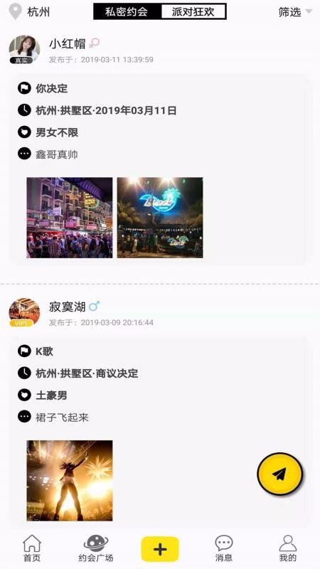 3.广场:支持线上自由切换频道,报名参加约会或派对;
