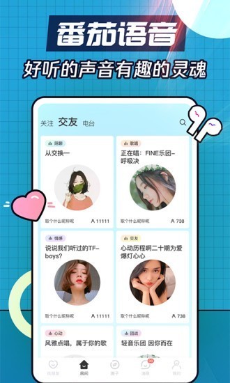 尽情的语音畅聊,与喜欢的人一起线上互动,收听你喜欢的声音,感受更暖心的互动聊天;一键开启直播间,随时都能够加入直播间内与更多人互动,感受群聊乐趣,认识更多好友;情感电台自由收听,一键点播喜欢的情感电台,与主播线上互动,让大家收听精彩的内容;用户们在番茄语音安卓版可以邀请兴趣相投的小伙伴们一起加入聊天室,讨论当下的话题,还要有十分多的有声电台可供挑选。在这里,你可以迅速找到和你配对俊男靓女欢度快乐时光,搜索自己感兴趣的内容就会有相关联的社区出现,社区中都是有着和你一样爱好的小伙伴,无论是生活聊天、语音开黑还是脱单交友,这里都能给你提供帮助,需要的朋友记得下载番茄语音。