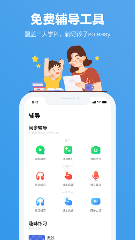 小盒家长APP是一款专为家长设计的教学软件,致力于帮助家长完成对孩子学习的辅导,让家长能够轻松了解孩子所有学习情况;软件推出辅导板块,这里汇聚大量能够帮助用户辅导孩子学习的资源,资源分为速算练习、阅读、听书等多种类型,用户可以根据老师反馈的孩子学习弱点来选择,让孩子在用户的辅导下完善自己的知识面;软件提供批改口算功能,当孩子口算作业完成后用户只需要将作业拍摄下来就能完成批改,系统会自动识别照片内容并标记出错误答案;软件推出学情板块,在这里用户可以查看孩子的日常练习完成情况,了解孩子的日常练习是否提交并检查练习,让用户轻松掌握孩子学习情况。