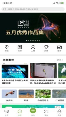 1、社区,随时了解鸟类信息,发现,附近鸟类相关内容,图片查鸟,上传图片智能查鸟;