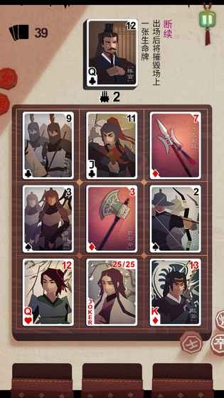 3、以三国为配景的立异游戏,游戏具有随机性,每一次的卡牌散布都是随机的。