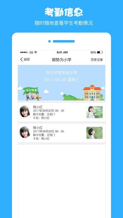 1、考勤信息实时推送,让家长实时掌握学生出入校动态。