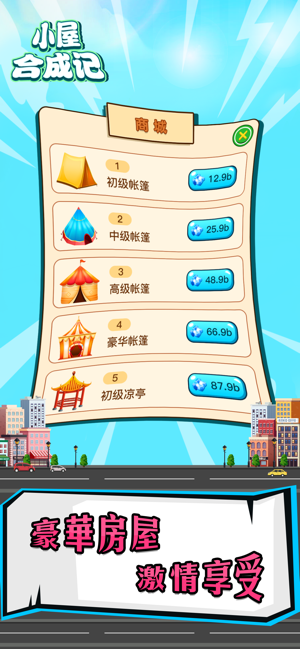 1、欢乐的合成体验,梦想中的豪宅以非常简单的方式完成,不用存钱买房。