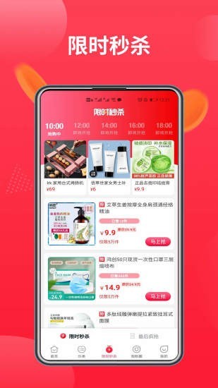 【限时抢】新增限时抢板块,购物得大额返利,商品限量0元抢,各种好物限时抢购,抢到就是赚到