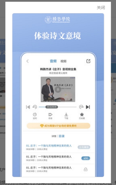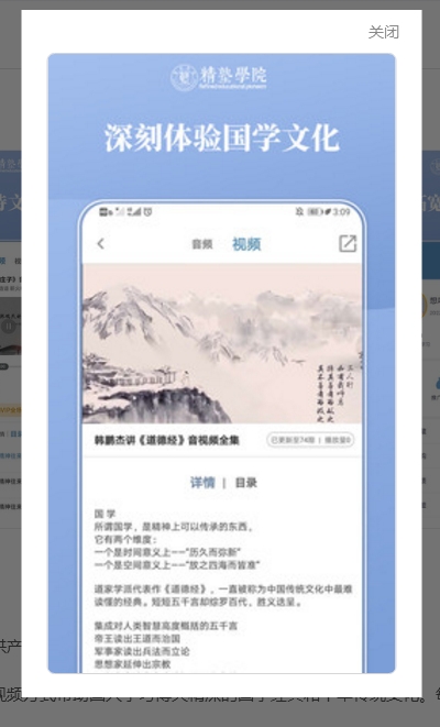 精塾学院App是一款为国学爱好者打造学习平台,每天都会有各位国学大师在线进行授课,用户可直接参与直播间来进行学习,通过讲授不同时代的国学经典故事,让一些永恒流传的名家著作得以保存下来。将会帮助各位用户深度的解读里面的寓意,充分的打造出一款有深度有意境的线上国学学习平台。致力于在中国传统文化领域提供产品和服务的学习型社区.深度提炼,精华解读,以通俗易懂的线上音视频方式帮助国人学习博大精深的国学经典和中华传统文化.每年300期国学精品课程,让国学,从启蒙到精熟.平台包含从古至今的诗词文学,国学名著等资源,更有专业名师的视频精品课程,各种知识内容等你来学习.感兴趣的朋友可以来下载.