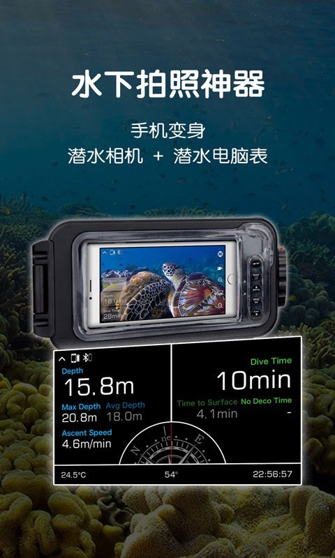 真的很实用。结合手机潜水壳,我们在拍照界面实时显示你的当前深度,上升速度等,不用再手忙脚乱的一边拍照一边看电脑表;当然,在你不需要拍照时,我们也提供纯净的电脑表界面