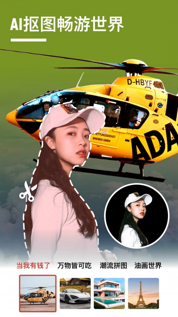 抠图壁纸相机app是一款抠图智能相机,抠图壁纸相机app,智能AI抠图相机软件,软件可以轻松可以帮你轻松抠图换背景,实现图片人像合,无需使用PS,不需要掌握复杂的P图软件,手机上即可帮你轻松实现抠图效果。抠图壁纸相机app采用ai智能抠图,轻松识别背景进行抠图,抠图壁纸相机app不需要掌握复杂的技能,简单的操作,轻松实现换背景,抠图壁纸相机app,大家都在玩的p图神器,Al智能抠图,创作零门槛!证件照、爆款光圈、公主造型、环游世界…