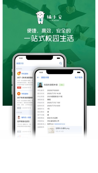 辅小安app是一款服务管理平台,这款软件可以让用户更好的了解各种不同的校园生活,而且享受到的校园生活非常的便利,用户可以更精准的了解校园生活的便捷,同时提供的各种服务更精准,不仅可以了解孩子在校的各种情况,而且还可以一键在线查询孩子的成绩信息。辅小安为在校师生提供优质方便的校园生活,师生可以通过辅小安考勤打卡、请假审批、查询成绩,辅小安共建智能化校园生活,轻松搞定所有校园生活中的难题,辅小安,便捷,高效,安全的一站式校园生活,拥有寝室签到、通知公告、信息采集、请假审批、即时通讯、账号管理等诸多服务内容,学习方式会很简单。