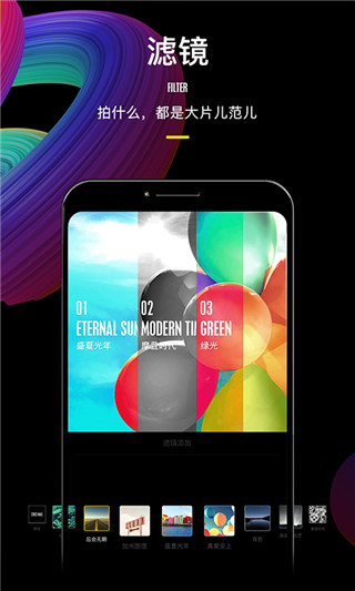 4、影片纹理滤镜的风格,便捷的多段视频编辑操作,时尚的高能酷炫贴纸和字幕,丰富而流行的氛围,让您充分体验拍摄的乐趣