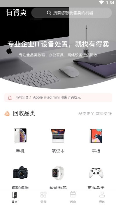 有得卖是国内全品类数码、综合二手回收平台。由中国人民保险和启迪控股联合投资,在电子产品回收领域已有4年专业经验。回收的品类包括:手机、平板电脑、笔记本电脑、数码影像、智能设备、电脑配件、大家电、服装、化妆品等12000多种品类,全方面满足了用户需求。