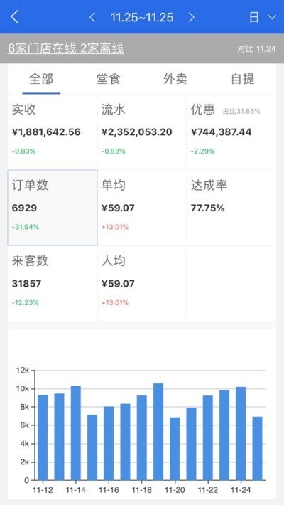 2、可以随时查看当前的营业情况以及外卖情况,各种经营数据都可以非常详细的展现出来;