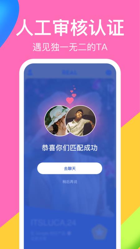 REAL app下载分享给大家。REAL是一款高品质陌生人社交APP,好看有趣的人都在这!真实又优质的单身青年。找到暗恋的人,发现谁喜欢你!快速匹配发现身边好看又有趣的人!大数据推荐精选和你最匹配的人,人工认证拒绝虚伪只为真实!根据所在位置,且有着面部识别的扫脸作用,刷脸社交,明星脸配对作用,用户必须脸部识别登录,脸部识别取得成功后,会显示信息“欢迎光临Real的全球”,激话后就可以应用,系统软件会根据脸部识别后得出标识,分辨用户的性情、长相。