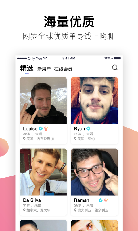 Only u婚恋软件是一款安全、优质的全球恋爱交友平台,汇聚全球优质单身男女,信息真实,资料全面,可根据用户需求一键配对,轻松聊天,快速找到心仪对象,告别单身。