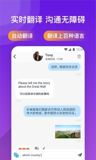 2.在线实时聊天,在手机上可以与外国友人进行实时的对话聊天;