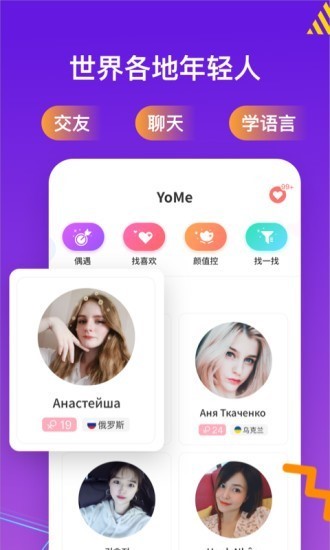 YoMe是一款社交app,主要用于不同语言的交流,想要学习外国语、锻炼外语口语以及外文翻译的人可以到此寻找聊天的小伙伴,这里汇聚了全球各种国家的人,用户可以在此与韩国人、美国人、英国人以及俄罗斯人等群体进行即时的语言交流,在此可以图文消息,如果在聊天过程中遇到不懂的单词或是句子,可以一键转换为中文,同时,如果自己想要表达的内容不知道怎么翻译的话,可以在输入中文的前提下一键转换为外语,这样就能达到与别人的聊天畅通无阻,而自己也能结交到更多的外国友人,在此可以与小伙伴进行各种话题的讨论,如学习对方的国家文化之类,总之,这款应用有趣又实用,赶紧下载吧。