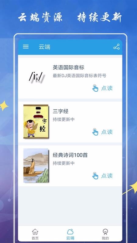 2、不同的模式让您在线的进行选择不一样的点读或是跟读的模式内容,帮助孩子更好地进行英语上的提升。