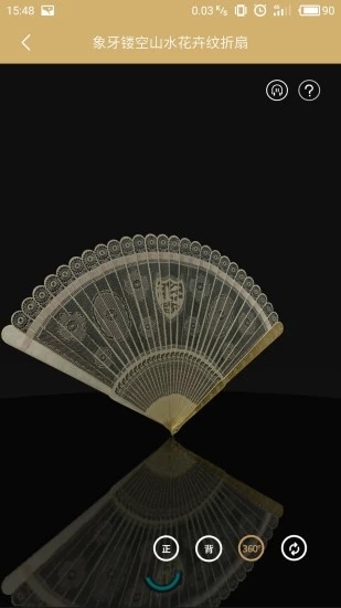 在“古祠看展”中,还精选了《扇子上的东方与西方:18-19世纪的中西成扇》中的15件精美扇子进行三维技术展示,360度浏览这些展品,每一方寸的美感都尽收眼底!