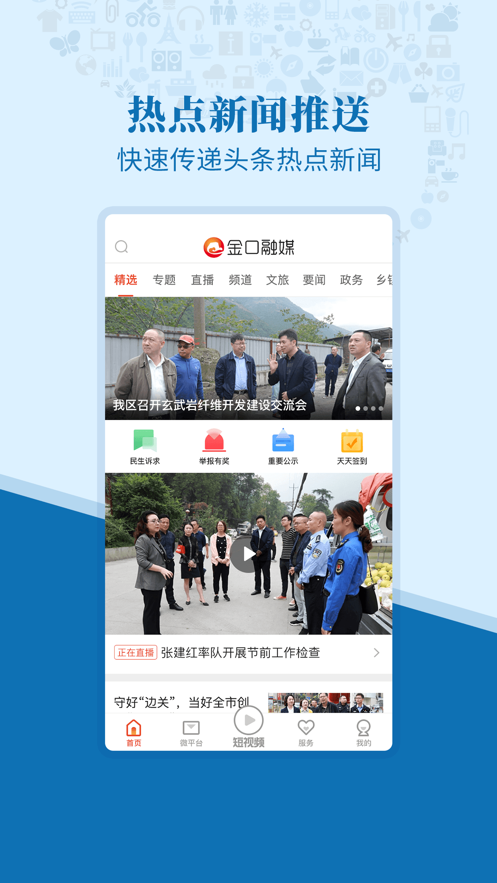 金口融媒是一款拥有丰富的新闻资讯的阅读app,用户能使用这款app阅读海量的新闻资讯,为你推送许多热点新闻,传递更多热点事件,还能选择不同的类型查看新闻,让你能够看自己喜欢的新闻,为你个性化推荐许多有趣的身边新鲜事,还能在这里获取到丰富的便民生活服务,你也可以看到许多有趣的短视频内容,发布动态等。金口融媒app中涵盖了本地的各种最新的资讯,健康、生活,政务等等,在软件中中你每天都能搜索到自己需要的各种政务,让你轻松的就能了解到本地最新的热点民生信息,金口融媒体移动平台,平台拥有新闻资讯,微平台,短视频,服务等等诸多功能内容,可以帮助用户更好的阅读新闻及便捷生活。