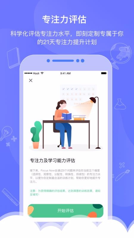 1、专注力评估,科学化评估专注力水平,即刻定制专属于你的专注力提升计划;