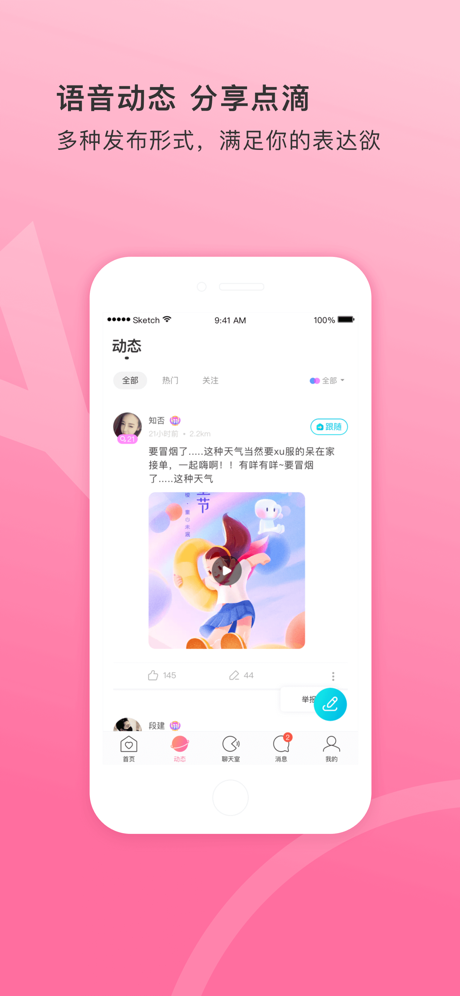 全民语音是一款很火爆的手机在线语音交友软件,在这里有很多优质的交友活动,一起在线进行语音聊天,加入聊天广场,一起在线畅聊,用户还可以在线k歌,超多有趣好玩的功能等你来体验,感兴趣的朋友不要错过。也是一款安全系数很高的线上社交软件,有来自全国不同地区的用户都能找到心仪的内容,对于全部的小伙伴们来说都是给力的,总是可以帮助您找到想要的资源,线上全部的服务和信息都是免费更新的,还可以进行智能推荐的操作哦。
