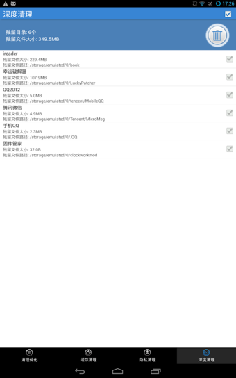 3、深度清理:清理软件运行时产生在SD卡上的垃圾文件